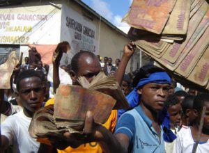 Struggling to push his small fishing boat out to sea, Hassan Yasin grumbles over what he and other coastal Somalis...