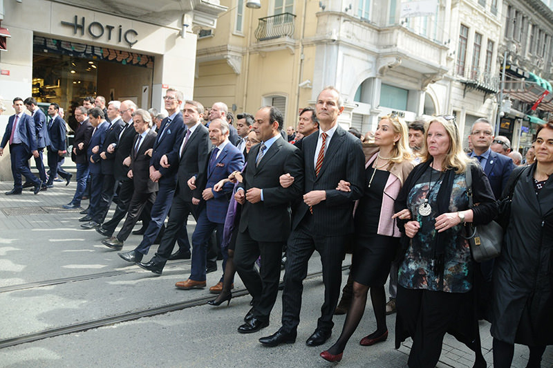 The consul-generals of 20 countries and district mayors of Istanbul joined arms on Istanbul’s famed İstiklal Avenue three days after a suicide bombing killed five people and a few hours after a major terror attack in Belgium’s Brussels that killed at least 34 people.
