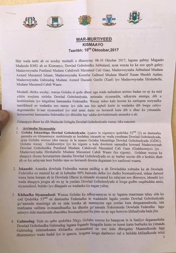 Maamuladii ku shirayay Kismaayo ayaa war ka soo saaray kulankoodii mudada dheer qaatey. Maamuladan gaarayay shanta oo qaarkood muran ka taagnaa in ay yihiin madaxda saxda ayaa warmurtiyeed soo saaray.