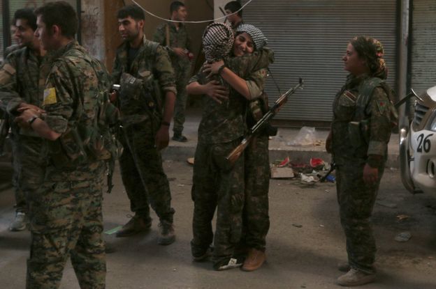 Magaalada Manhij ee dalkaasi Siiriya ayaa xulufo Carab iyo Kurdiyiina ka xoreeyeen argagixisada Daacish kadibna dadkii aya farxa ooyey waxayna bilaabeen in ay deg deg u gubaan una xiiraan.