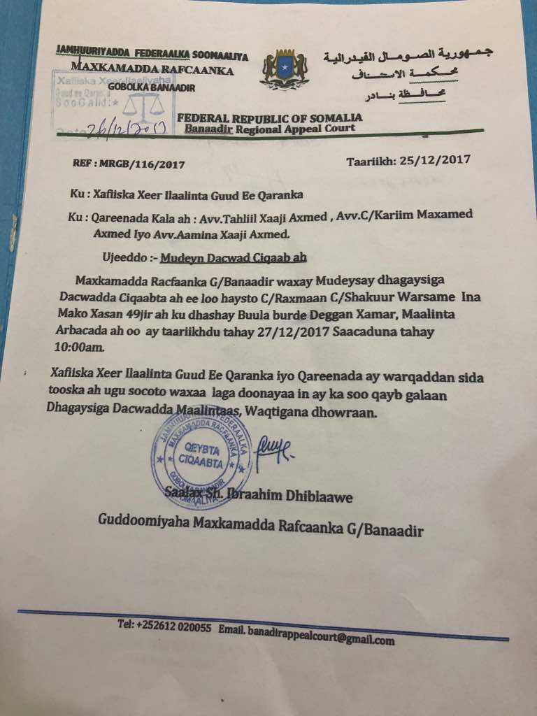 Sidoo kale Xafiiska Xeer Ilaalinta ayaa lagu wargeliyay inay ka soo qeyb galaan dhageysiga dacwada, saacadu marka ay tahay 10-ka subaxnimo.