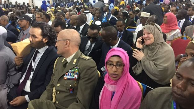 Munaasabada goordhaw bilaabatay waxaa sidoo kale ku sugan Madaxweynaha la caleema saarayo Farmaajo, Gudoomiyaha Baarlamaanka Soomaaliya, Madaxweynihii hore ee Soomaaliya Xasan Sheekh, R/Wasaaraha waqtigiisa dhamaaday, Wasiiro, Xildhibaano iyo masuuliyiin kale.