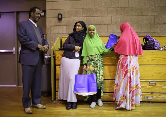 Mohamed Mohamud visited with program staffer Saytun Bundid as they stood near two participants, both of whom have a bag of goodies that all received on the final day of the program Tuesday. JEFF WHEELER, STAR TRIBUNE